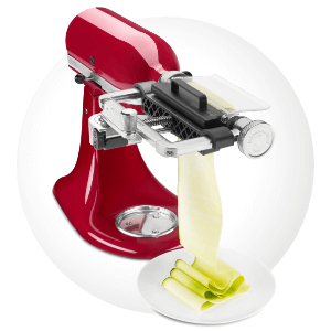 Attach the Vegetable Sheet Cutter to a stand mixer. Turn the blade release lever so there is room to fit in the zucchini.